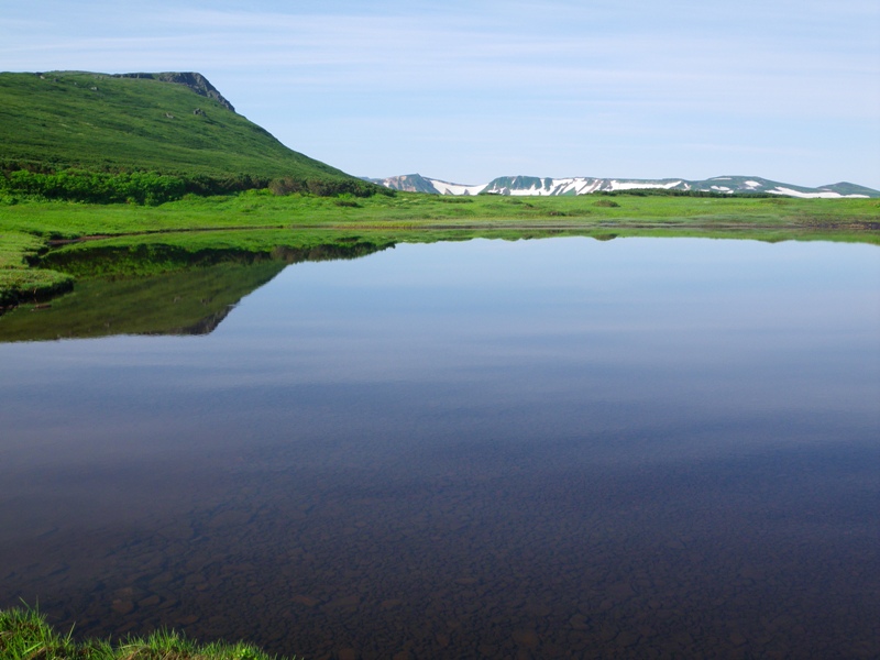 天気は最高で、ヒバリや小鳥の声が聞こえろ。遠くにトムラウシの姿がドッシリと見えて素晴らしい道。少し歩いたところで暑くなってきて、半袖シャツ1枚になる。